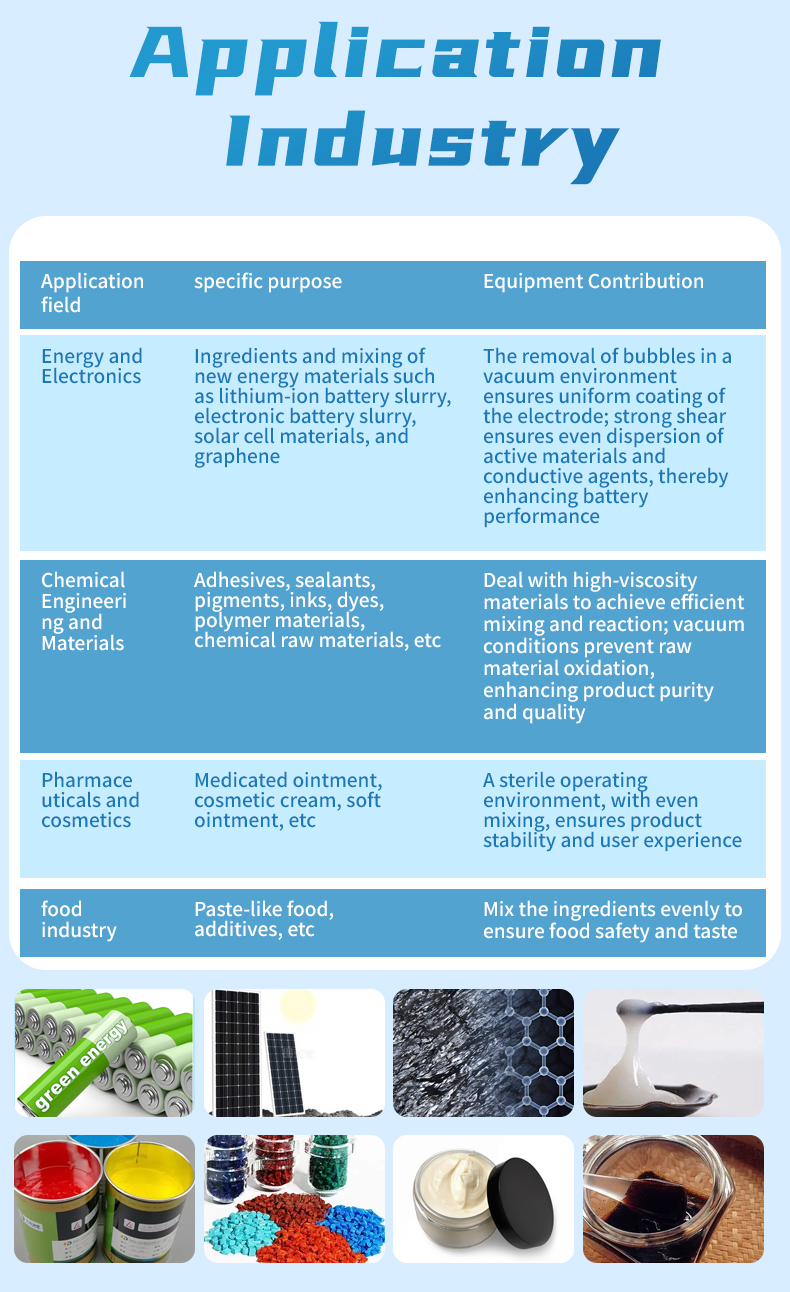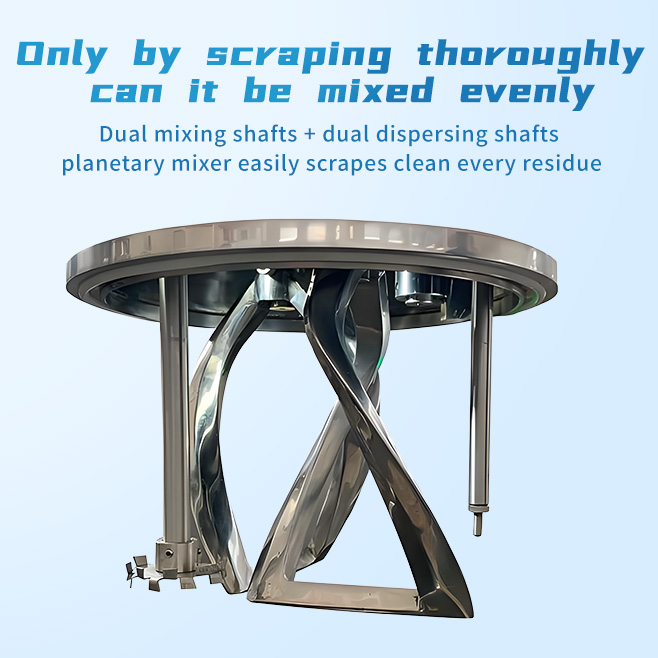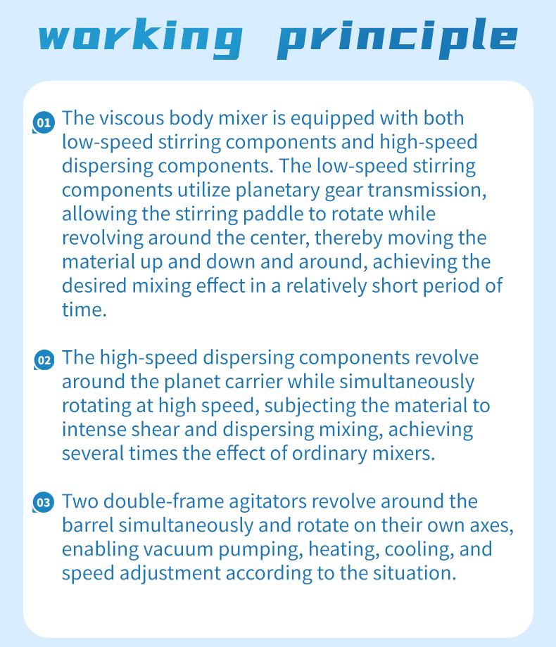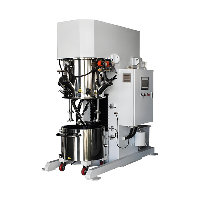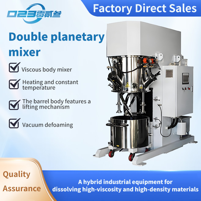 The dual planetary mixer (also known as a viscous material mixer) is an industrial equipment used for the dissolution, mixing, compounding, and reaction processes of high-viscosity, high-density materials. It is primarily used in the electronics, chemical, pharmaceutical, food, and new energy industries. Through planetary gear transmission, it achieves a complex motion of the mixing paddles involving both revolution and rotation. Combined with the shearing action of a high-speed dispersion shaft, it can cover over 97% of the material contact surface and supports various mixing systems, including liquid-liquid and solid-liquid mixtures.