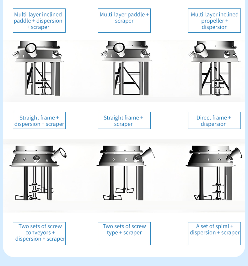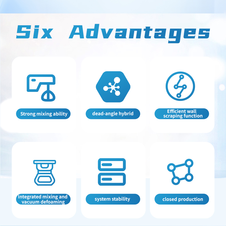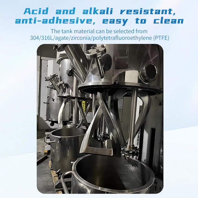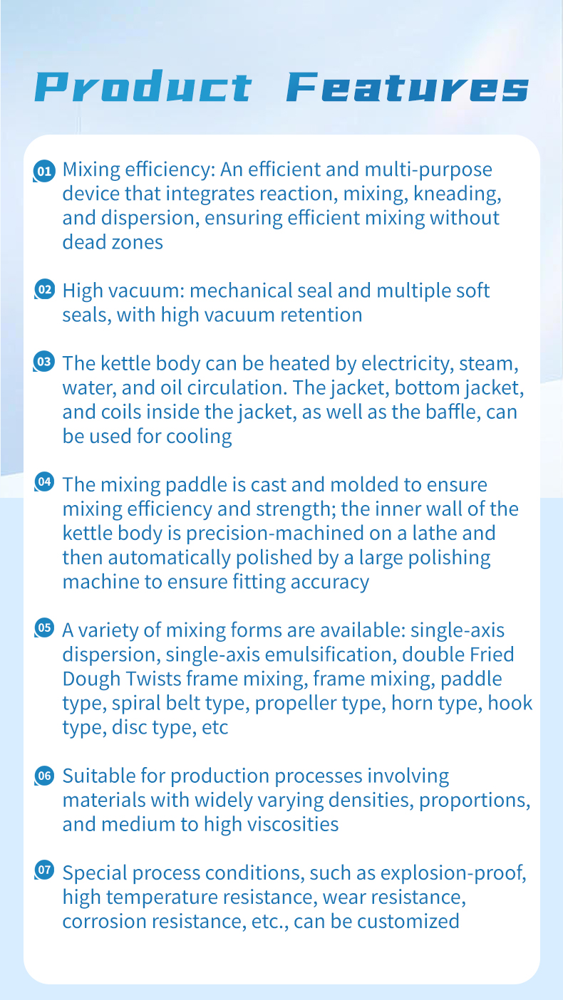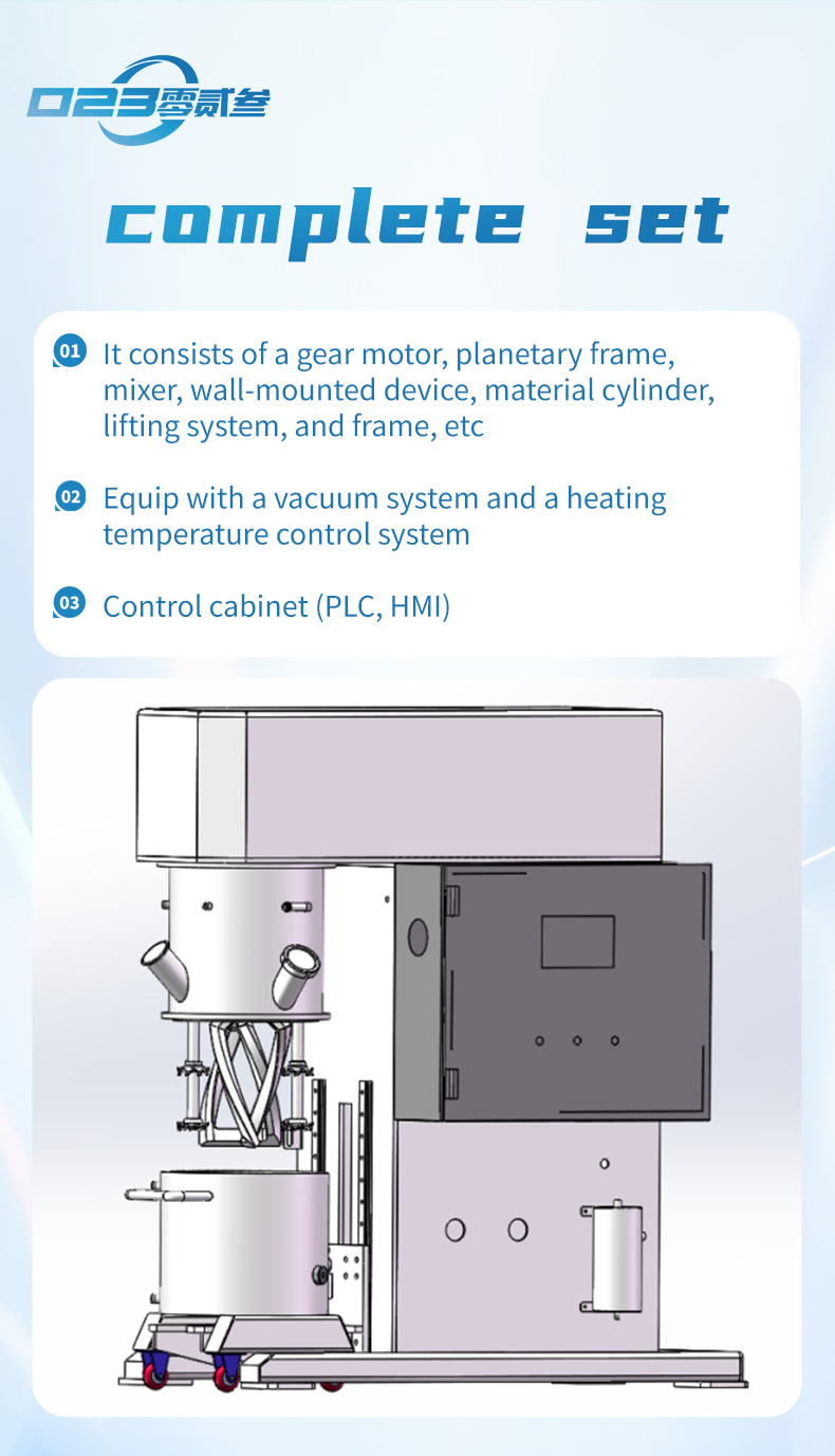 The dual planetary mixer (also known as a viscous material mixer) is an industrial equipment used for the dissolution, mixing, compounding, and reaction processes of high-viscosity, high-density materials. It is primarily used in the electronics, chemical, pharmaceutical, food, and new energy industries. Through planetary gear transmission, it achieves a complex motion of the mixing paddles involving both revolution and rotation. Combined with the shearing action of a high-speed dispersion shaft, it can cover over 97% of the material contact surface and supports various mixing systems, including liquid-liquid and solid-liquid mixtures.