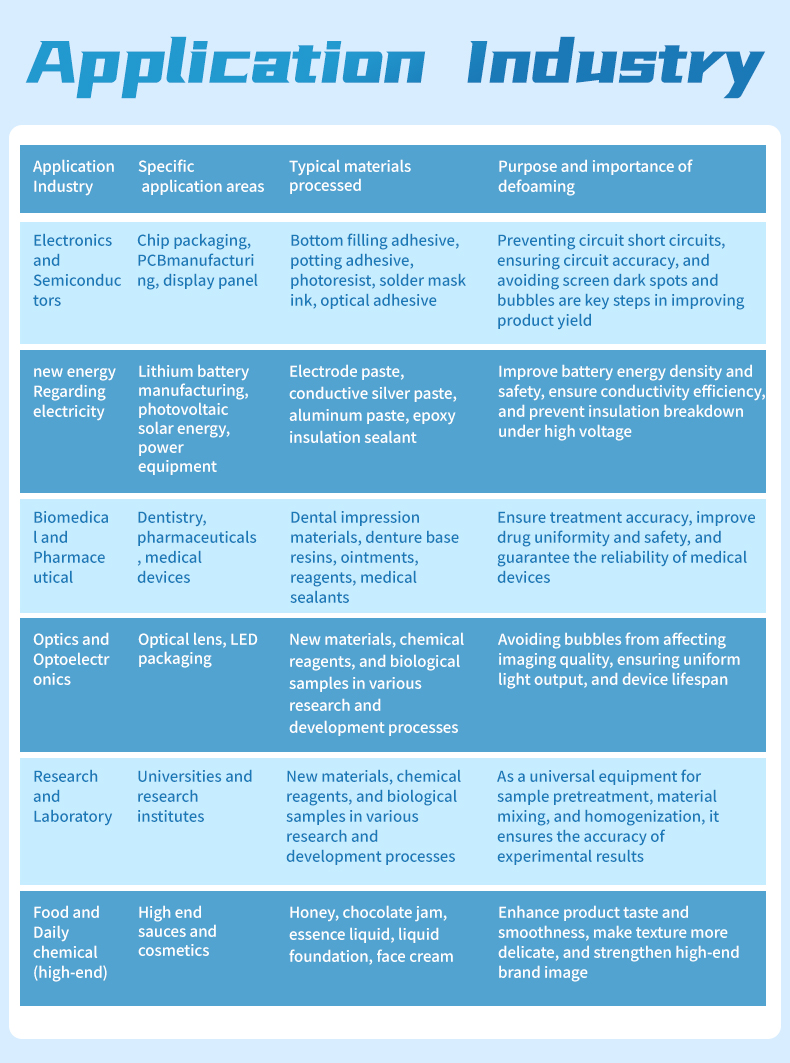 A vacuum defoaming machine is an industrial device primarily used for mixing and defoaming materials such as LED phosphors, silver paste, and epoxy resin. This equipment utilizes a combination of rotation and revolution for mixing, simultaneously achieving both mixing and defoaming functions. It is suitable for high-quality printing in high-density packaging applications. Its safety features include a lid closure sensor, vibration sensor, and rotation speed sensor to ensure safe operation.